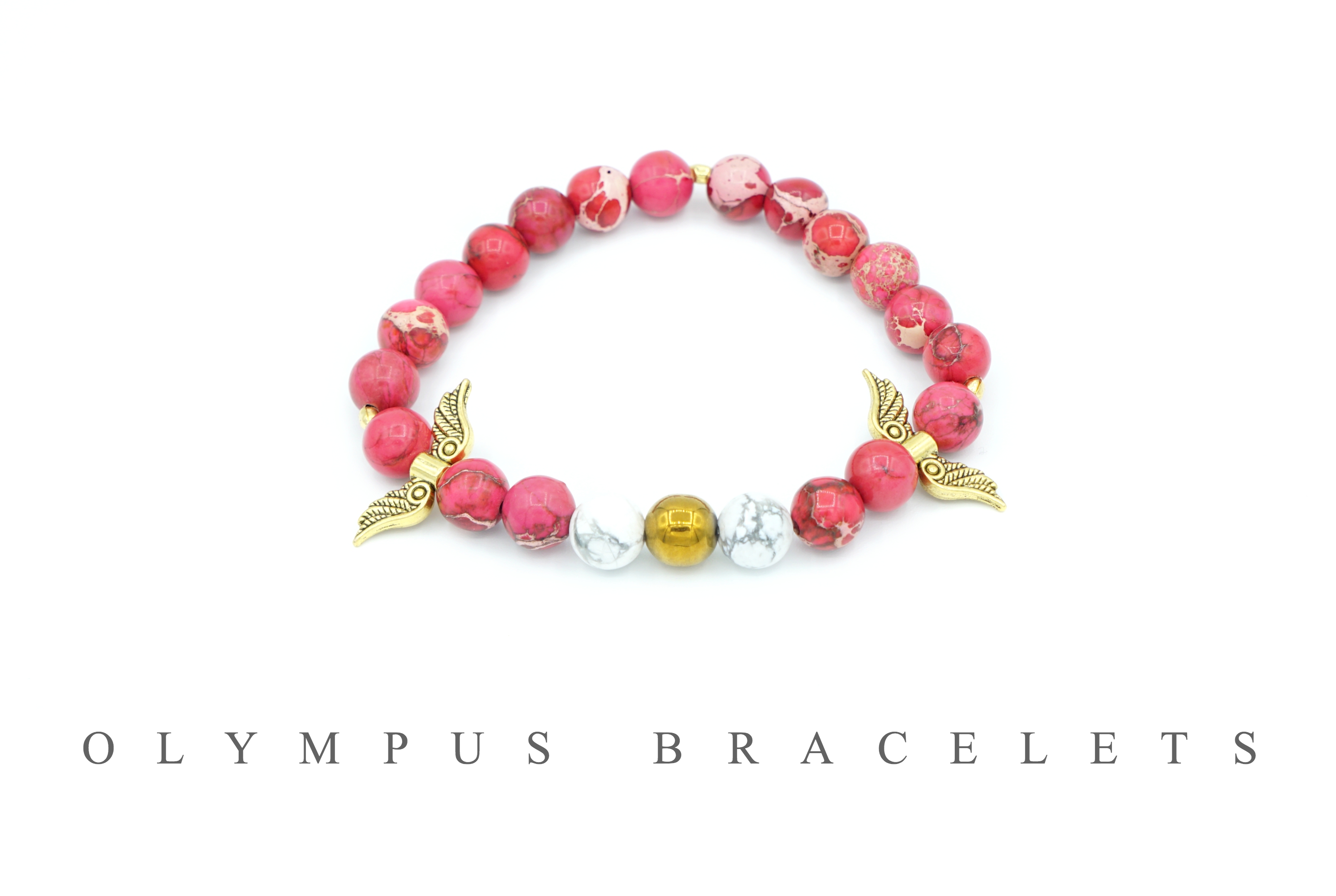 WiOB: Eos is made with Rose Sea Sediment Jasper Gemstones, Natural White Howlite Gemstones, a Hematite Gold Plated Gemstone and topped with our Signature Olympian Wings.