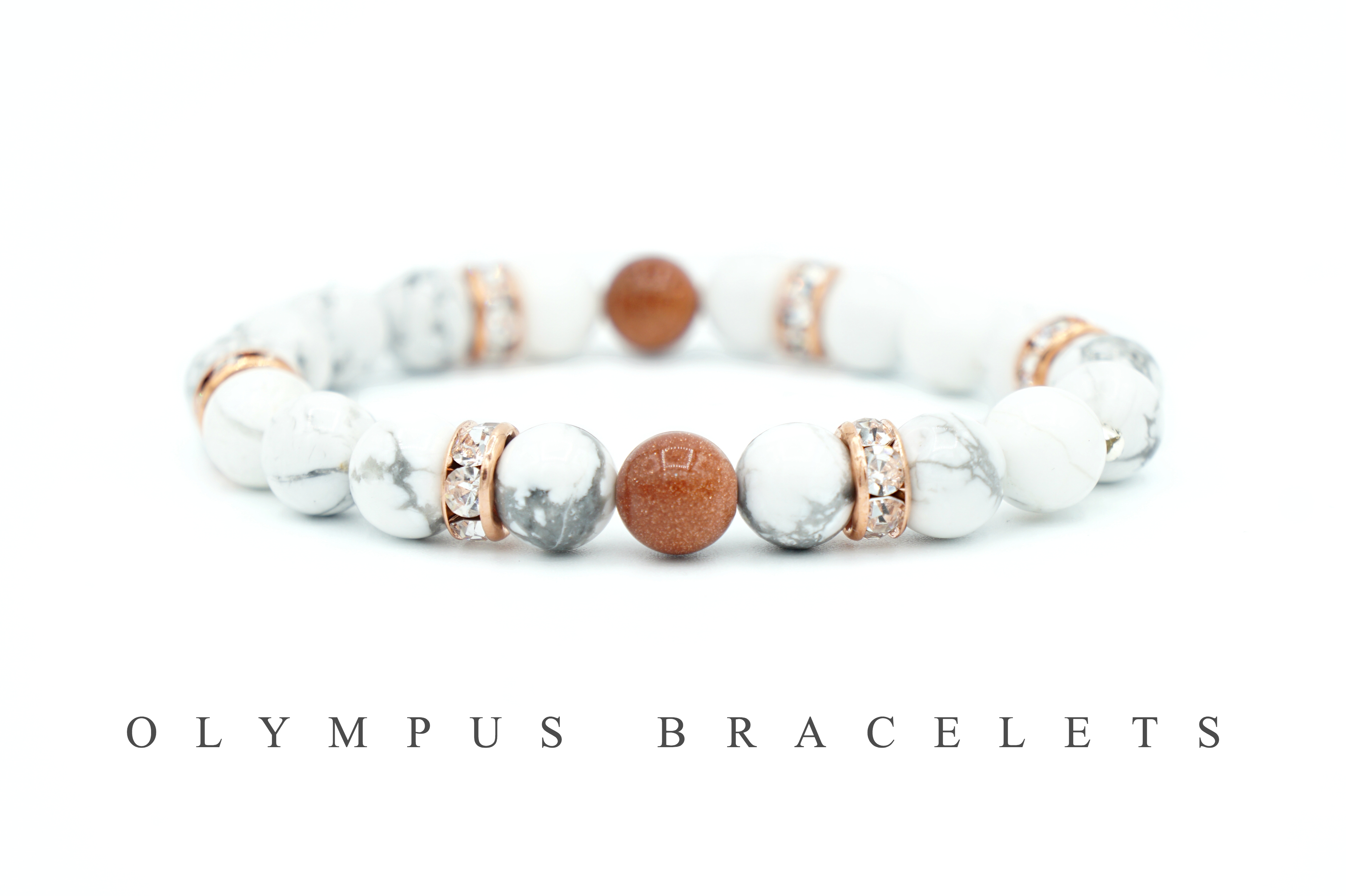 WiOB: Thalia is made with Natural Howlite Turquoise Gemstones, Beautiful Gold SandStone Gemstones and Rose Gold Rondelle Spacer with Brass Rhinestone.