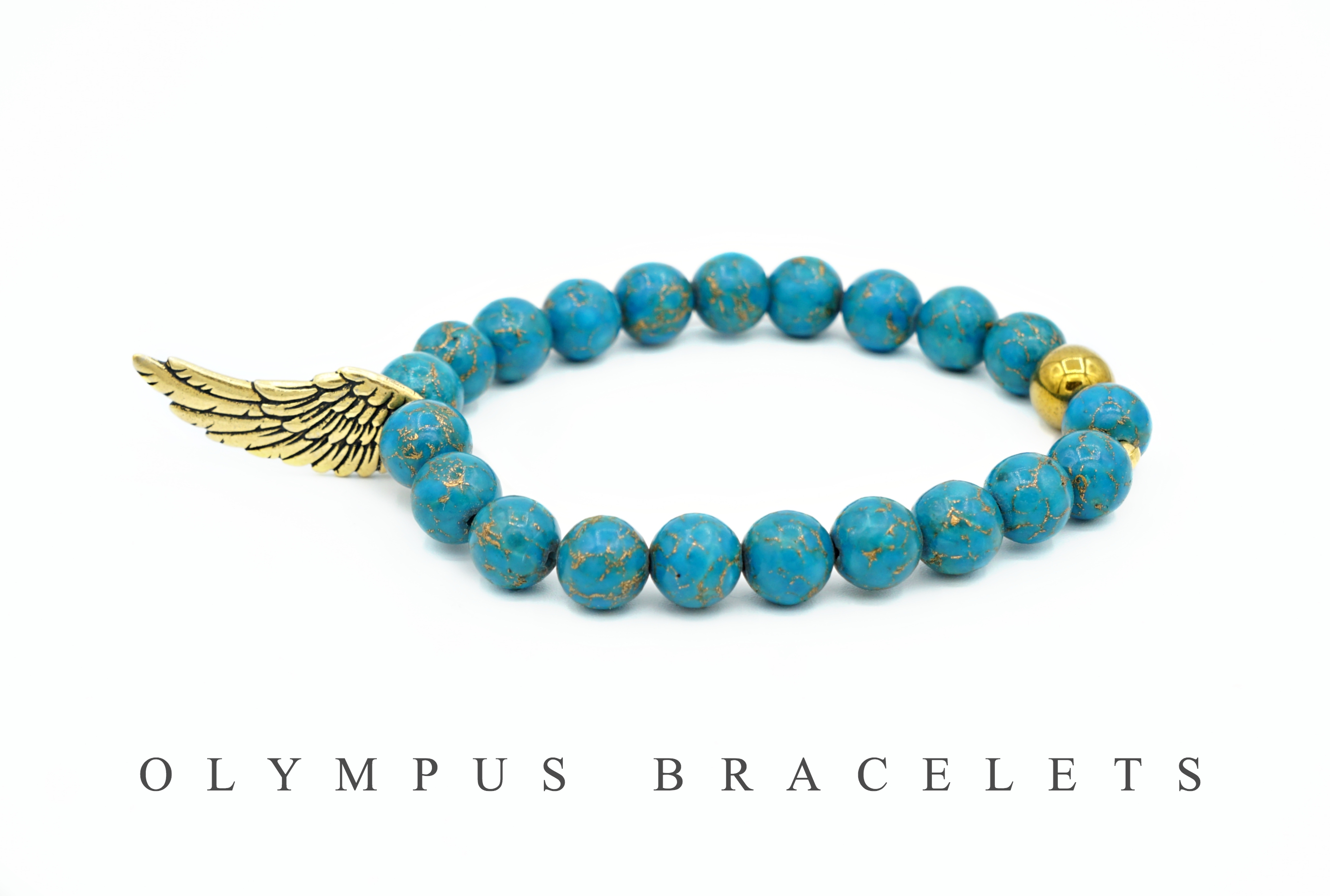 WiOB: Hermes is made with Turquoise gemstones with Pyrite, a gold plated hematite gemstone and topped with a Hermes-Exclusive Olympian Wing.