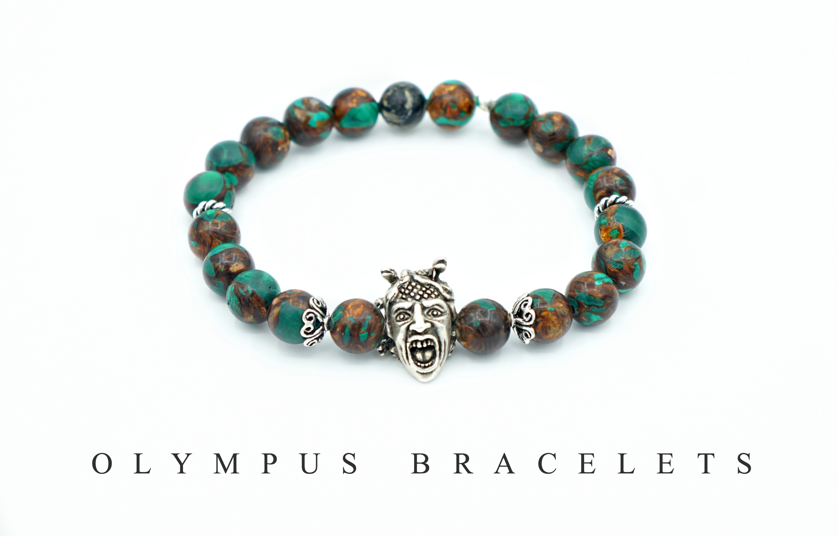 WiOB: Medusa is Made with Malachite and Bronzite Gemstones, Two 925 Sterling Silver Flower Caps, Two 925 Sterling Silver RopeShield Spacers and a Matt Silver Medusa Head Charm.